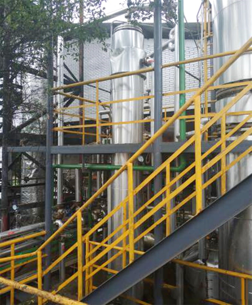 母液從進料口,通過真空負壓進入蒸發(fā)器上端,經(jīng)過分液裝置讓液體形成薄膜從上而下,此時,夾套蒸汽對物料加熱,冷凝水從底部排出,薄膜液體在高真空下10至20秒內(nèi)就汽化,汽化出來的汽體進入氣液傳質(zhì)系統(tǒng),在低壓降的高真空傳質(zhì)系統(tǒng)內(nèi)傳質(zhì)交換,高沸液相回流到蒸發(fā)系統(tǒng)重新蒸發(fā)或排放;汽相部分一部分回流,另一部分從塔頂采出進入成品罐;塔釜高沸母液定期排出。該系統(tǒng)可以進行連續(xù)精餾,也可以進行間歇精餾,視產(chǎn)品質(zhì)量和產(chǎn)量要求而定。系統(tǒng)高真空設計及安裝是本系統(tǒng)關鍵,要保證蒸發(fā)室內(nèi)達到高真空對系統(tǒng)部件(填料-蘇爾壽)選擇及匹配很重要。